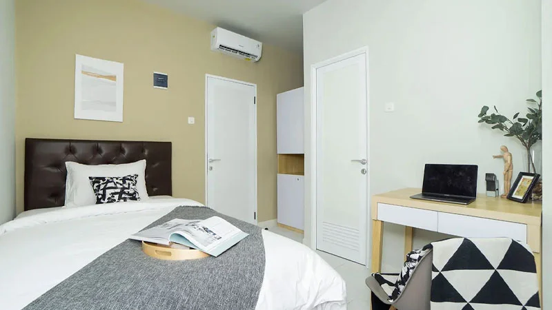 Tempat tidur queen lemari pakaian besar meja kerja kursi ergonomis AC kamar mandi dalam air panas TV LED kulkas mini Wi-Fi Bersama